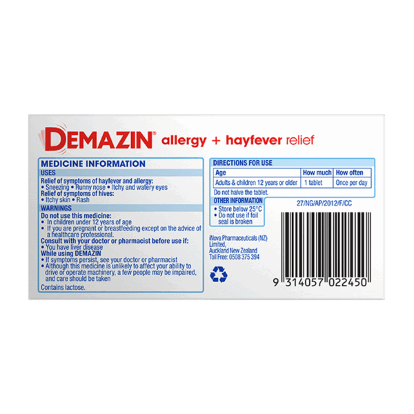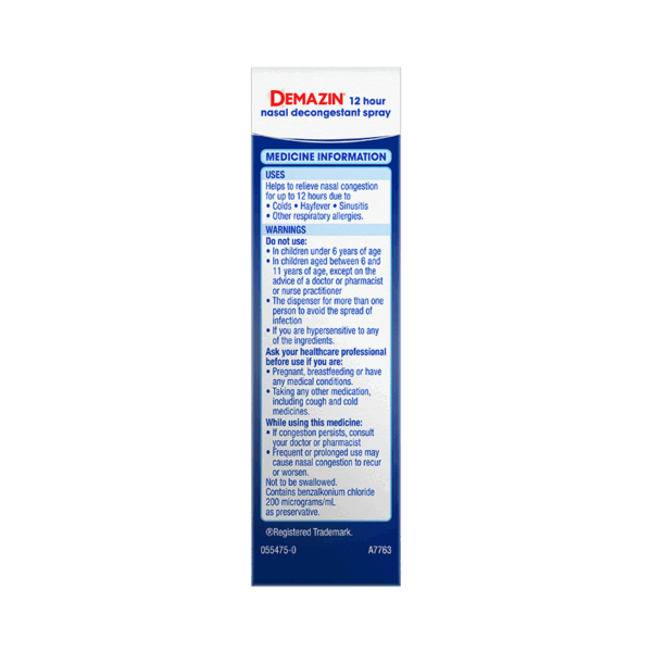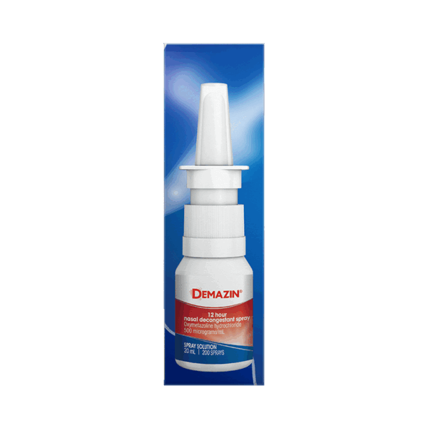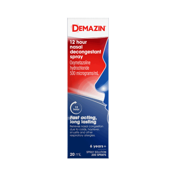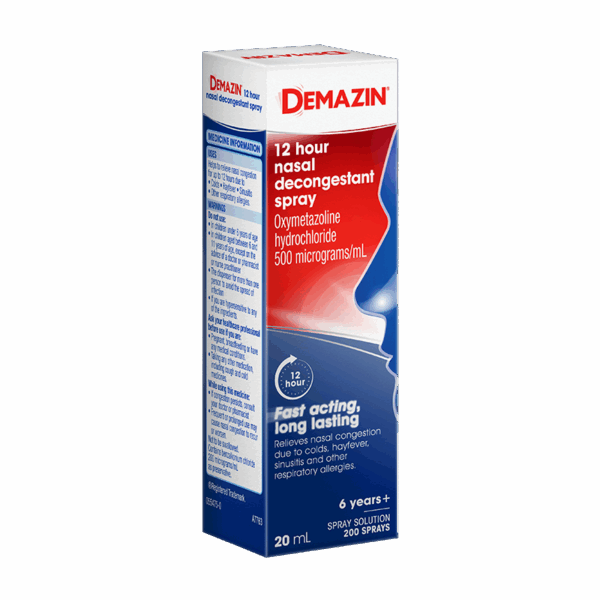 DEMAZIN 12 Hour Nasal Spray provides fast, long-lasting relief from nasal congestion associated with colds, allergies, hayfever & sinusitis. Suitable for adults & children aged 6 years & over. Ideal for patients seeking non-prescription, targeted nasal relief. Each bottle delivers up to 200 sprays.